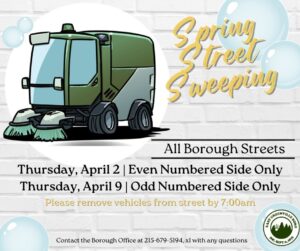 The Borough will be street sweeping the even-numbered house side of all Borough streets on
