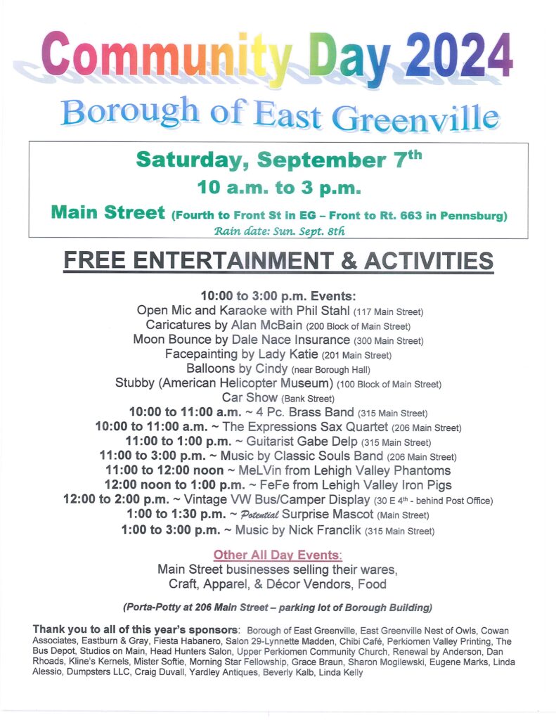 East Greenville Borough’s Community Day for 2024 will be Saturday, September 7 from 10am-3pm (rain date is Sunday, September 8). We are still accepting registration requests from businesses, crafters and vendors who would like to sell items, promote their business, fundraise for an organization, display information, etc. There is no registration or set-up fee for table space.