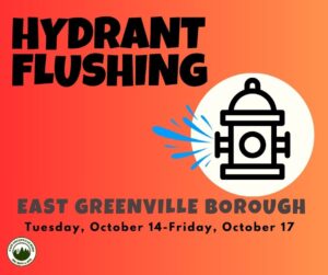 The Water Department will be flushing fire hydrants on Tuesday, October 14-Friday, October 17. This will take place during normal business hours. Water may be