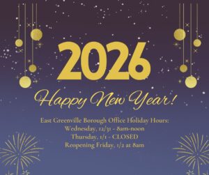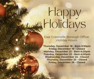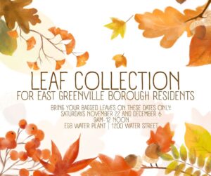 East Greenville Borough residents can bring their bagged leaves to the Water Treatment Plant (1200 Water Street) on Saturdays, November 22 and December 6, 9am-12