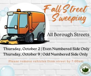 The Borough will be street sweeping the even-numbered house side of all Borough streets on Thursday, October 2nd and the odd-numbered house side of all