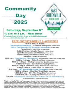 East Greenville Borough is celebrating their 150th anniversary this year!! All are welcome to an Open House at 206 Main Street during Community Day on